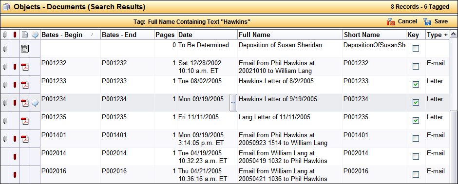 After a search is run, search results display in two areas in CaseMap: the Search Results pane and the spreadsheets pane. Search results include matches for field text located in spreadsheet records, text in linked files, and text found in annotation notes for linked files.