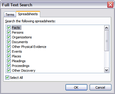 Clear the Select All check box to clear all spreadsheets and then select those that you want to include in the search.