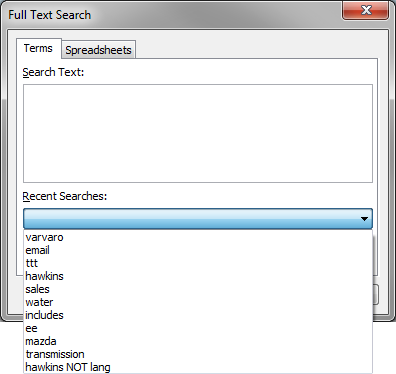 2.In the Full Text Search dialog box, click on the Recent Searches list to view the last 15 searches run.