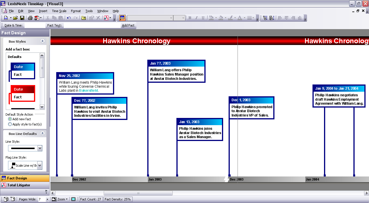 TimeMap® is a timeline graphing tool that allows you to import critical case facts from a CaseMap case so you can build a timeline to organize and chart them in a visual chronology.