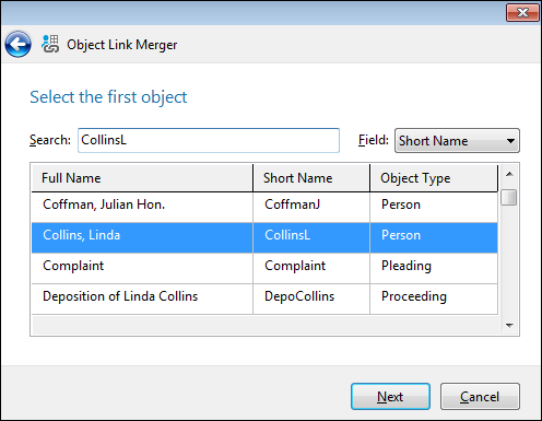 If two objects with similar short names are entered into the case and are actually the same object, you need to merge them together to reduce linking and sorting consistencies in the case. Using the Object Link Merger tool, you select one object to keep and one to delete, and the utility transfers the links for you.