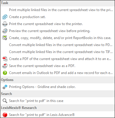 | 2. | In the SmartAssist Search Results box, select/click the desired item in the Search Results list to perform its specified function (i.e., Reports, Tasks, Options, LexisNexis Research etc.). |