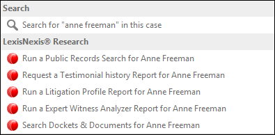 | • | Persons, Organizations (e.g., Anne Freeman) to display a list of options and/or tasks that uses the search term related to the object type. The search results returns a display that are grouped by category types for searching within the CaseMap case or to conduct LexisNexis Research. |
