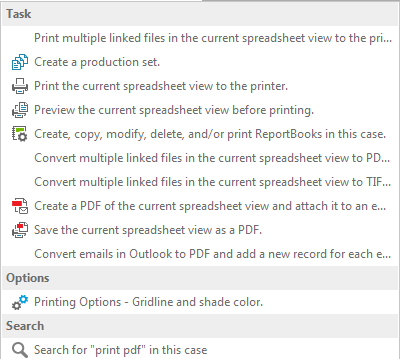 | • | phrases — (e.g., print PDF) to display a list of options and/or tasks that uses the search phrase 'print PDF'. The search results returns a display that are grouped by category type (e.g., Tasks). |