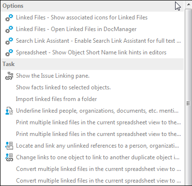 | • | Options -- Open the CaseMap application options dialog and navigate to a specific tab. |