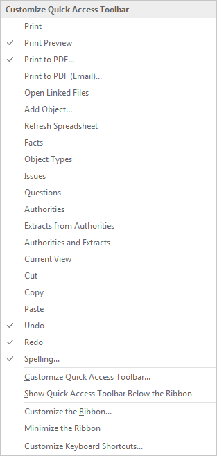 icon in the upper left corner of the Quick Access Toolbar to view a listing of the buttons available. Button selections change depending on what spreadsheet is active when you view the toolbar button listing. Simply select the buttons to add/remove buttons that you use most often. All checked buttons display on the toolbar.