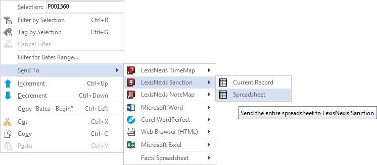 | 5. | On the LexisNexis Sanction submenu, click Spreadsheet to send the entire spreadsheet to the Exhibits subfolder called 'From CaseMap' in Sanction. |