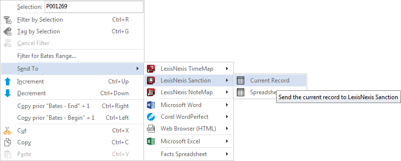 | 5. | On the LexisNexis Sanction submenu, click Current Record to send the selected record to the Exhibits subfolder in Sanction called, From CaseMap. |