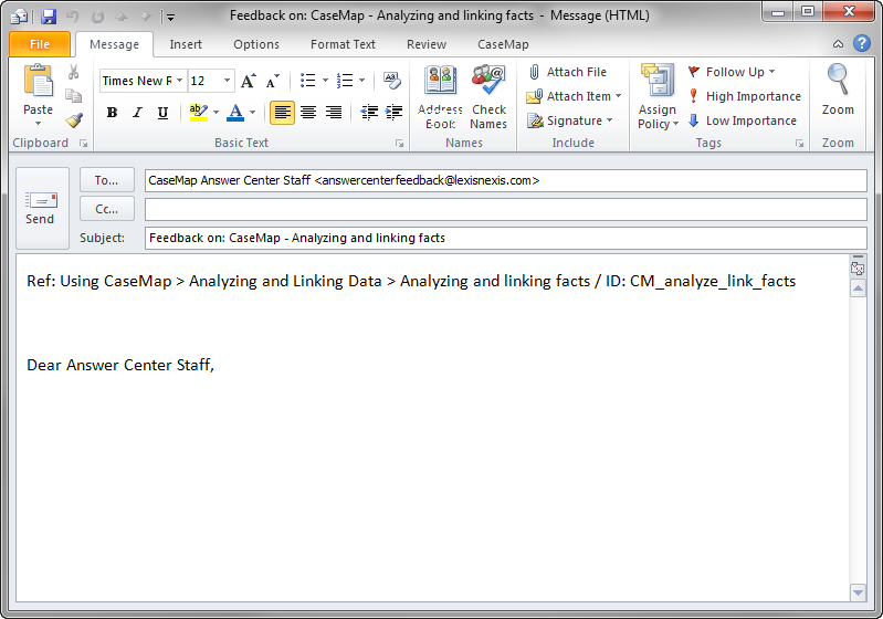 To send the CaseMap Answer Center team feedback not relating to a specific topic, email us at: answercenterfeedback@lexisnexis.com