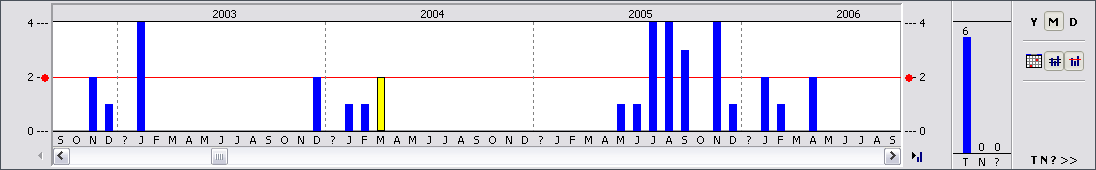 You can change the CaseWide timeline to view fact records by year, month, or day. In Year view, you can view more than three decades of fact history without need for scrolling. |