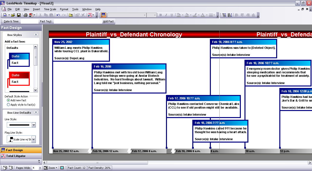 If you want to create your own robust timeline chronology, you can use CaseMap's companion product, TimeMap®. TimeMap is a timeline graphing tool that allows you to import critical case facts so you can organize and chart them using facts boxes that float above or on either side of a timeline. You can customize the timeline to best suit your needs. Use TimeMap timelines during meetings to keep clients and staff up to date on case developments. Use TimeMap's presentation mode or enlarge and mount the timelines for use in hearings and during trial so a jury or other large audience can view the facts illustrated into key points.