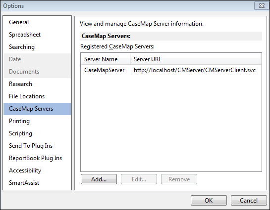 | 2. | In the Options dialog box, click the CaseMap Servers tab. |