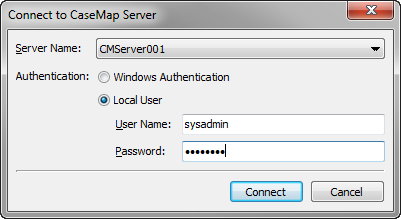 | 2. | In the Connect to CaseMap Server dialog box, type in or select the server you want to connect to in the Server Name field. |