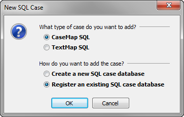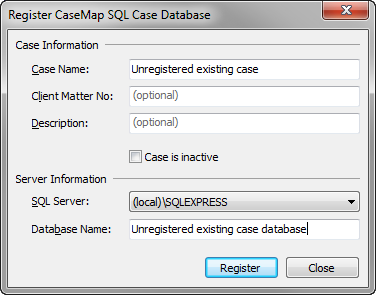 This dialog box is named Register CaseMap SQL Case Database, if you selected CaseMap SQL.