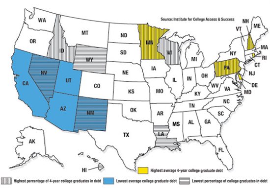 Lowest average college graduate debt: New Mexico*, Utah, California, Nevada*, Arizona