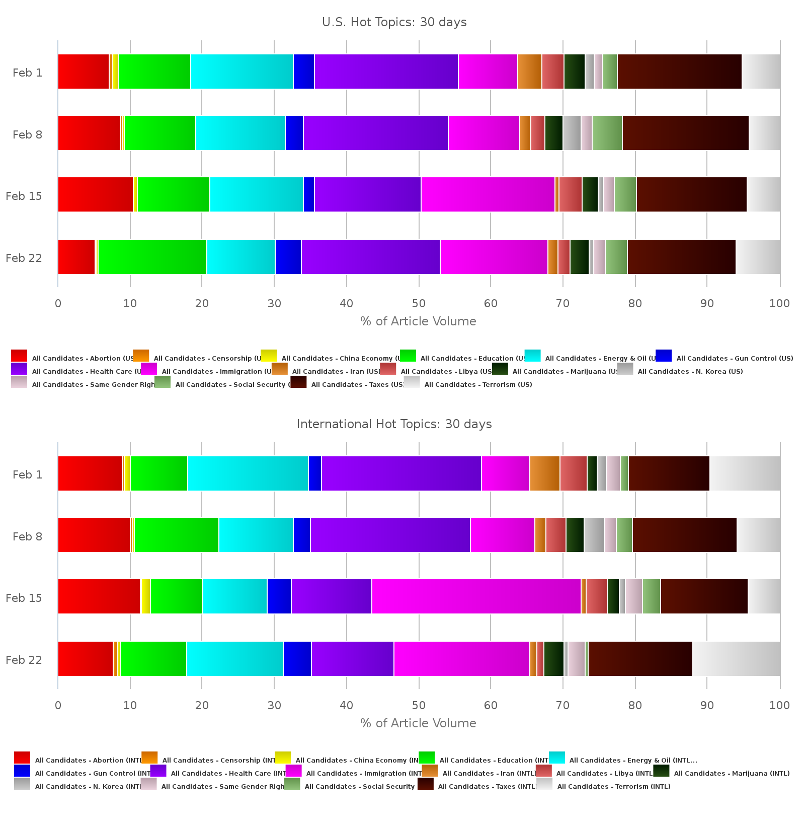 The issues have frequently taken a back seat to the personalities associated with Election 2016, but that doesn’t mean hot topics aren’t still making the news. The volume of stories about key campaign issues is another point of comparison between U.S. and international media.