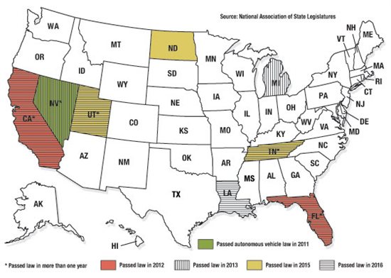 Nevada became the first state to authorize the operation of autonomous, or self-driving, vehicles in 2011. In the years since then, seven other states - California, Florida, Louisiana, Michigan, North Dakota, Tennessee and Utah - and the District of Columbia, have passed legislation related to such vehicles. Several of the states, including California, Florida and Nevada, have passed laws in two different years.
