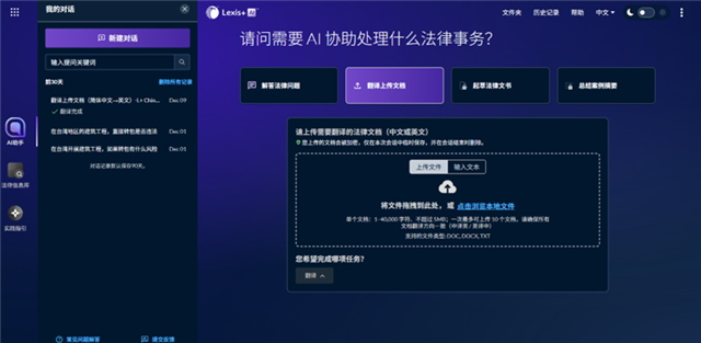 翻译上传文档功能的上线,标志着 Lexis+ AI China 在法律工作流上的进一步完善。