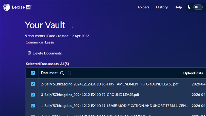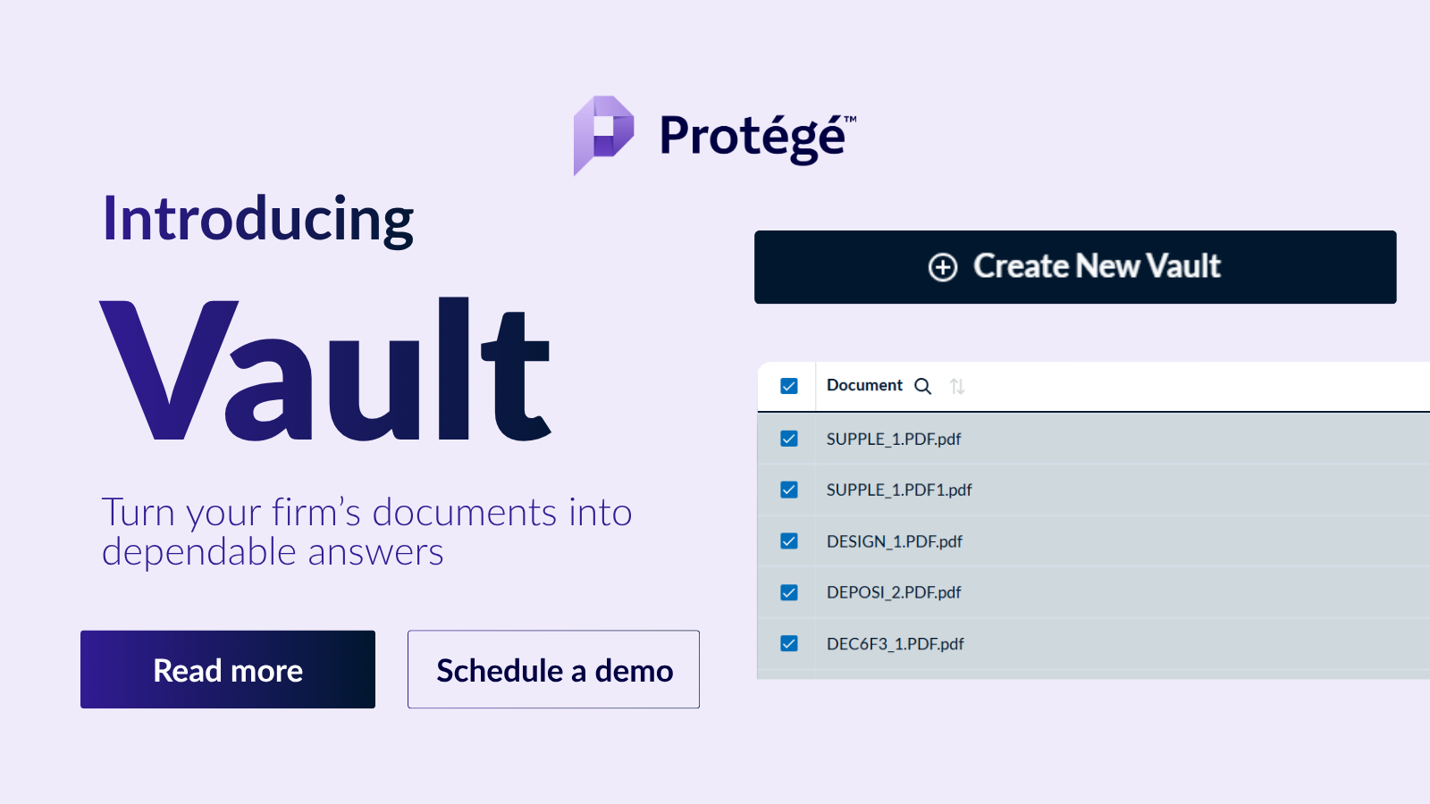 Vault provides a secure, persistent workspace within Protégé where your firm’s documents remain available throughout the life of a matter. You can return to the same materials to continue analysis, refine drafts, or revisit earlier questions, without having to recreate context.