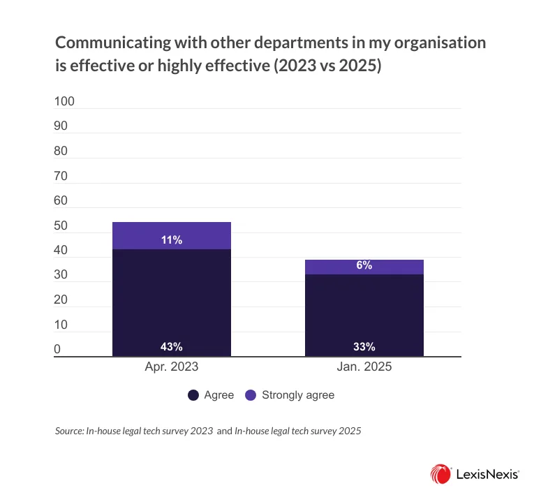 In April 2023, 54% of in-house counsel believed communication with other departments was effective. Two years on and this has dipped to 39% of in-house counsel agreeing or strongly agreeing. In a corporate setting, inter-department relationships can be strengthened by being solution-focused, says Cheryl Gale, Head of Legal at children’s audio speaker, Yoto, in a recent interview. Legal teams should strive to be as visible as possible, using tools like Slack channels as a 'legal front door' to facilitate direct communication with different departments, says Gale.