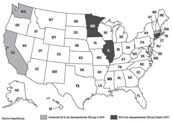 Lawmakers in at least three states have introduced legislation this year that would impose a tax on corporations that pay their chief executive officers far more than their average workers, according to Inequality.org, a project of the Washington, D.C.-based Institute for Policy Studies. Four states failed to pass high-CEO-to-worker-pay-ratio tax measures in 2017, after Portland, Oregon became the first city to adopt such a tax in 2016. San Francisco’s City Council has also approved a motion to place a CEO-pay tax measure on the city’s March 2020 ballot.
