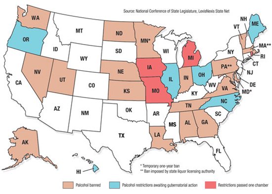 Palcohol banned: Alabama, Alaska, Connecticut, Georgia, Indiana, Kansas, Louisiana, Maryland*, Minnesota*, Nebraska, Nevada, North Dakota, South Carolina*, Tennessee, Utah, Vermont, Virginia, Washington, Pennsylvania**, Massachusetts**
