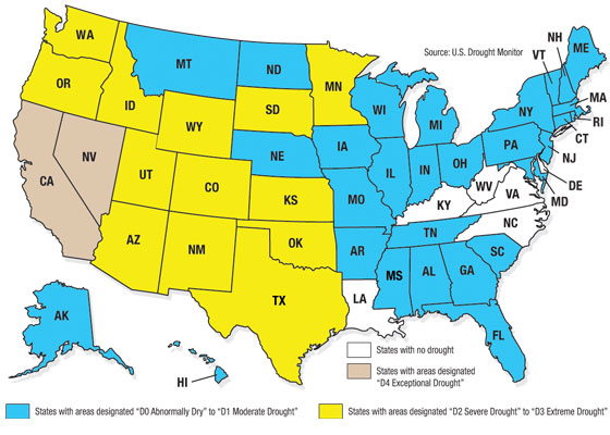 States with areas designated “D2 Severe Drought” to “D3 Extreme Drought”: Washington, Arizona, Texas, Oklahoma, Oregon, Colorado, Minnesota, Wyoming, South Dakota, New Mexico, Utah, Idaho, Kansas 13