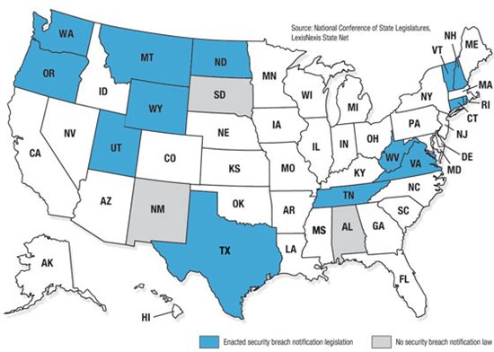 No security breach notification law: Alabama, New Mexico, South Dakota