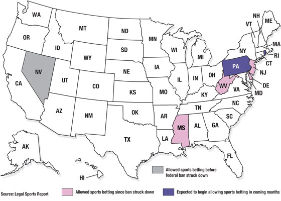 Since the U.S. Supreme Court struck down the federal ban on sports betting on May 14, four states have joined Nevada in allowing such wagering within their borders, according to the Legal Sports Report. Those states include New Jersey, where the sports ban case originated. Two other states are expected to begin allowing sports betting in the coming months. Nevada legalized sports betting in 1949.