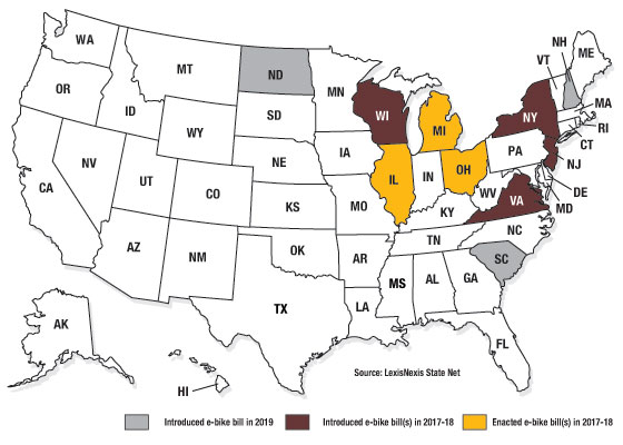 At least three states - New Hampshire, North Dakota and South Carolina - have introduced legislation dealing specifically with electric bicycles so far this year, according to LexisNexis State Net’s legislative tracking system. Last session, e-bike bills were introduced in seven states, three of which enacted such measures.