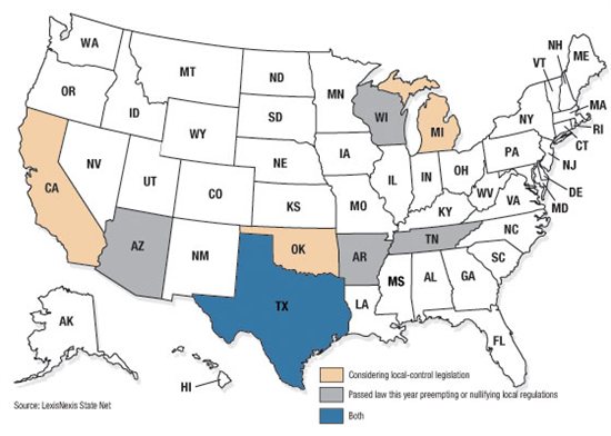At least five states have passed laws this year nullifying or preempting local ordinances, including those regulating ride-sharing, fracking and concealed-weapons permits, according to analysis by LexisNexis State Net. Local-control legislation is also pending in at least four states, including two bills prohibiting the installation of red-light cameras in Texas, which has already passed HB 40, effectively blocking local fracking bans in the state.