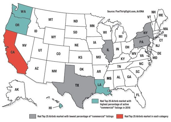 According to a 2016 analysis of Airbnb booking data by the website fivethirtyeight.com, among the 25 cities with the largest Airbnb markets at that time, Honolulu, Hawaii had the highest percentage of active listings that were rented at least 180 days a year, at 21.1 percent. The other Top 25 markets with the highest share of such “commercial” listings were Portland (15.6 percent), Los Angeles (15.5 percent), Seattle (12.5 percent) and New Orleans (11.9 percent). The top Airbnb markets with the lowest percentage of commercial listings were New York (8.0 percent); Austin, Texas (6.9 percent); Chicago (6.7 percent); San Jose, California (6.1 percent); and Philadelphia (5.4 percent). But even in Airbnb’s largest U.S. market, New York, with 2,464 commercial listings, that number was only a fraction of the city’s roughly 2.2 million total rentals.