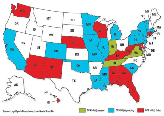 DFS bill(s) failed: Alabama, Arizona, Connecticut, Florida, Georgia, Hawaii, Kentucky, Maryland, Nebraska, New Mexico, Washington, West Virginia, Wisconsin