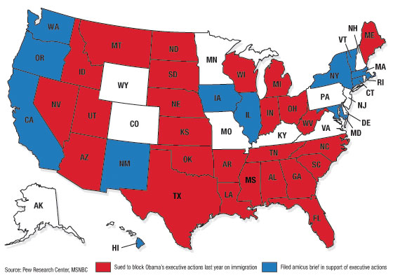 Sued to block Obama’s executive actions last year on immigration: Alabama, Arizona, Arkansas, Florida, Georgia, Idaho, Indiana, Kansas, Louisiana, Maine, Michigan, Mississippi, Montana, Nebraska, Nevada, North Carolina, North Dakota, Ohio, Oklahoma, South Carolina, South Dakota, Tennessee, Texas, Utah, West Virginia and Wisconsin