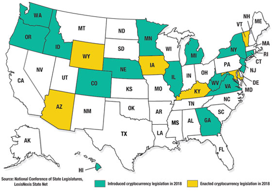 At least 21 states have introduced bills or resolutions dealing with digital currencies in 2018, about double the number of states that did so last year, according to analysis by the National Conference of State Legislatures and LexisNexis State Net. Six states have enacted such measures this year. One of the states, Wyoming, enacted three of them.