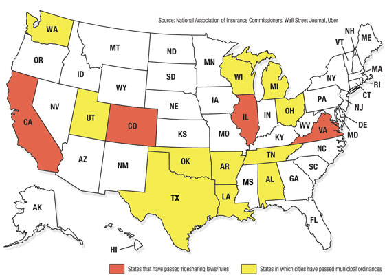 States that had passed ridesharing laws/rules as of March 2015: California, Colorado, Illinois, Virginia
