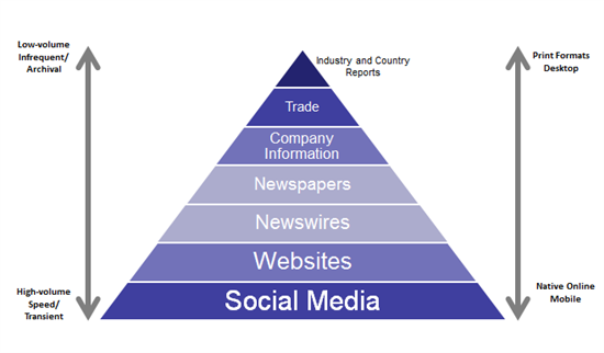 We’ve conceptualized these content types by grouping them in a pyramid to represent the media landscape. From the highly processed and low volume ‘industry and country reports’ to the high volume, transient content types such as social media.