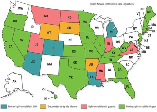 Enacted right-to-try bills in 2014: Arizona, Colorado, Louisiana, Michigan, Missouri