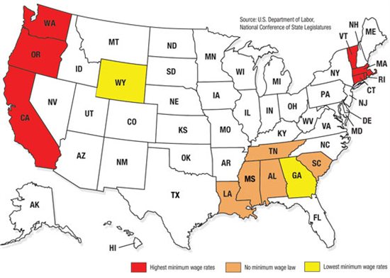 Highest minimum wage rates: Washington, Oregon, Connecticut, Vermont, California, Massachusetts, Rhode Island