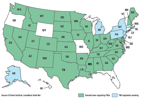 Thirty-seven states have passed laws regulating transportation network companies (TNCs), according to the R Street Institute and LexisNexis State Net’s legislative tracking database. The most recent addition to that group is Delaware, where Gov. Jack Markell (D) signed SB 262 last week. TNC legislation is also pending in six other states.