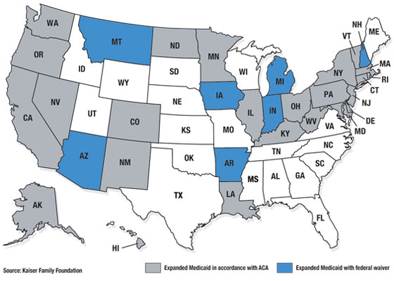Thirty-one states and the District of Columbia have expanded Medicaid in accordance with the Affordable Care Act (ACA) but left to states discretion by the U.S. Supreme Court’s ruling in National Federation of Independent Business v. Sebelius in 2012. Seven of those states have obtained federal waivers giving them more flexibility in designing their Medicaid programs to reduce costs and improve care.
