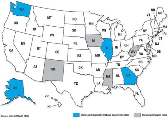 As of 2010, the state with the highest Facebook penetration rate - and conceivably one of the most social media-friendly populations, given Facebook’s status then and now as the nation’s most popular social networking site - was Washington, with 57.7 percent of its estimated 6,734,229 inhabitants users of the social networking service, according to the website Internet World Stats. The state with the lowest penetration rate at the time (24.2 percent of a population of 894,424) was Delaware.