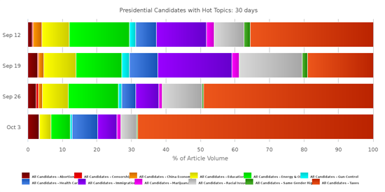 Above depicts the percentage breakout of “Hot Topics” both Presidential Candidates have discussed since July. These articles monitored include topics such as abortion, gun control, marijuana and other social issues. The biggest topics that have been discussed over the past 30+ days are clear: taxes, immigration, and racial issues. With the recent developments in Charlotte, North Carolina, racial issues certainly are on everyone’s minds represented by the gray sections, and make up approximately 13% of the topics discussed by the candidates since July. Compare that to taxes, which make up more than 35% of all topics discussed. It should be noted, however, that the number of news stories for taxes is inflated due to the focus on Republican Party nominee Donald Trump’s tax returns being discussed and scrutinized since the first Presidential Debate on September 26th.