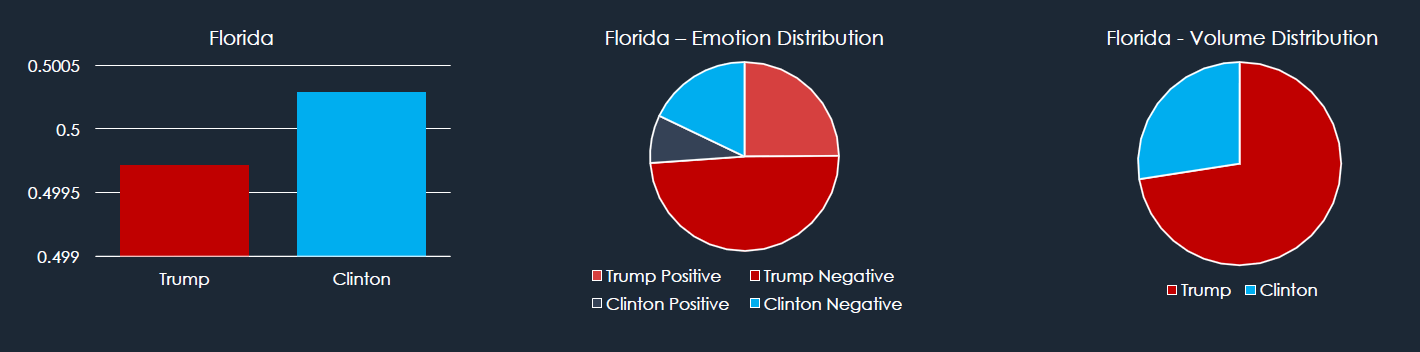 Sentiment in Florida is very close. Emotion and volume distribution closely mirrors Texas. 25% of tweets express positive emotion toward Trump, so there is strong enthusiasm. Conversely, negative emotion toward him is almost double at 49%.