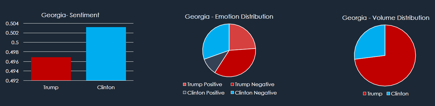 Emotion distribution provides insight into the level of enthusiasm. Negative emotion toward Clinton (30%) and positive emotion toward Trump (24%) comprise 54% of the emotions expressed. To further highlight Clinton’s challenge in Georgia, a higher percentage of negative emotion is expressed toward her than her percentage of tweet distribution (which also takes neutral or non-expressive tweets into account).