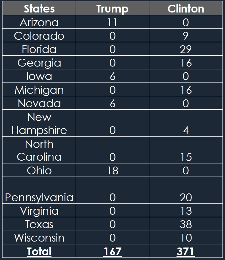 This chart, and corresponding table looks at these states, and what the electoral outcome would be if sentiment were both predictive and the only predictive measure.