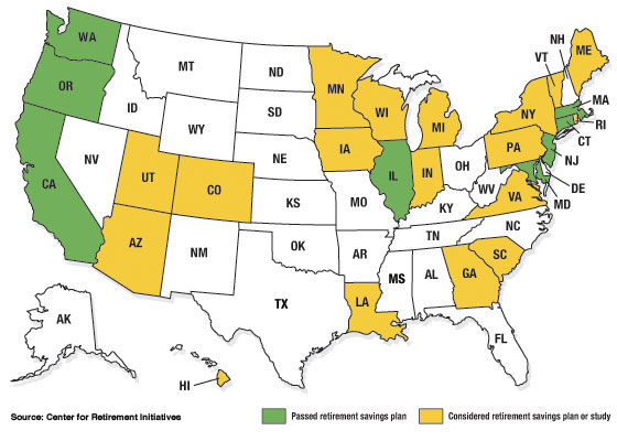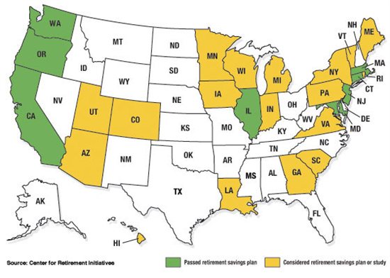 Because of California’s diversity and population — 39 million in the latest estimate — it will be by far the largest state laboratory for experimenting with the retirement savings idea. But it is not the only one. Connecticut, Illinois, Maryland, and Oregon have created retirement plans for private-sector workers that will take effect in 2017 or 2018. Massachusetts provides retirement plans to nonprofit employees and is studying the feasibility of doing so for all private-sector employees. Both Washington and New Jersey are establishing state-run online marketplaces that offer low-cost retirement savings plans to small businesses.