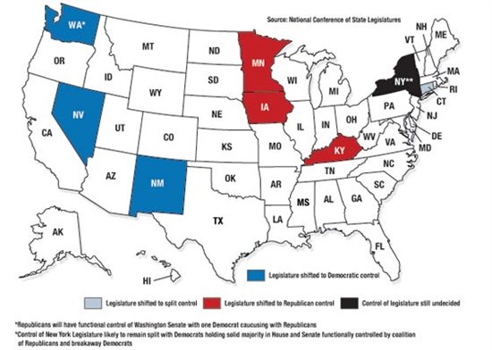 But Democrats only managed to pick up four Republican-controlled chambers: Nevada’s House and Senate, New Mexico’s House and Washington’s Senate. Those gains give the Democrats control of both chambers in three additional states, at least numerically; Republicans will still have functional control of Washington’s Senate, with one Democrat caucusing with Republicans. The Senate in Connecticut – despite being another state won by Clinton - shifted from Democratic control to an 18-18 tie with Republicans, splitting control of that state’s Legislature between the two parties as well. (At press time New York’s Senate was also numerically tied with one race still too close to call, but the chamber will likely continue to be functionally controlled by a coalition of Republicans and a group of breakaway Democrats.) Three other Democrat-controlled chambers, Iowa’s Senate, Kentucky’s House and Minnesota’s Senate - the former two in states won by Trump - also flipped to the Republicans, shifting those three legislatures from split to GOP control.