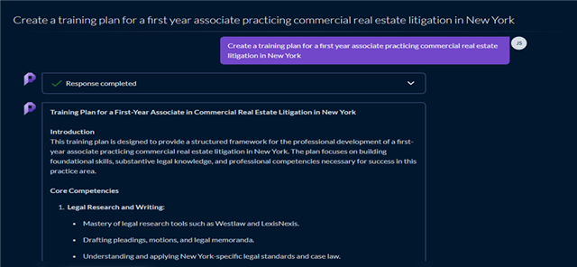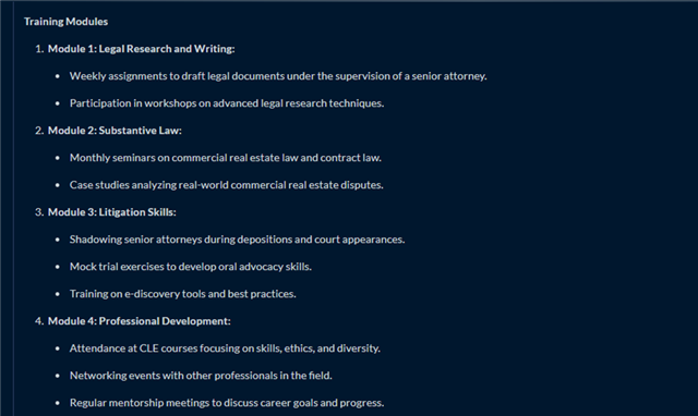 Ask Protégé to provide a training plan. You can make it more or less detailed by including a practice area, a jurisdiction, and level of experience of the trainee. For example: