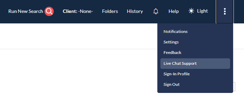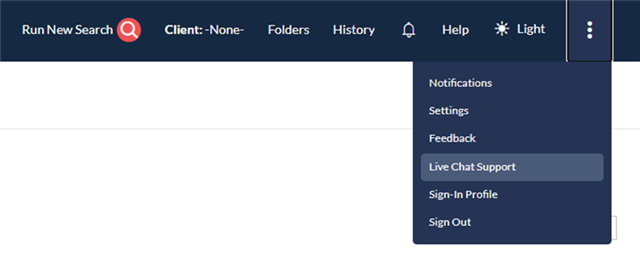 - To use Live Chat Support, simply click on the ellipsis at the top of the screen and select Live Chat Support: